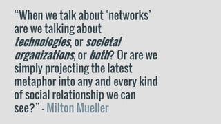 This document summarizes and compares three different types of networks: social network analysis, sociotechnical networks, and organizational networks. Social network analysis focuses on relationships between homogeneous human nodes. Sociotechnical networks consider relationships between heterogeneous human and non-human nodes. Organizational networks examine relationships and lines of authority between people within a phenomenon. The document outlines the key differences between each network type in terms of their nodes, links, analysis approach, and whether the network is viewed as a frame of analysis or phenomenon.