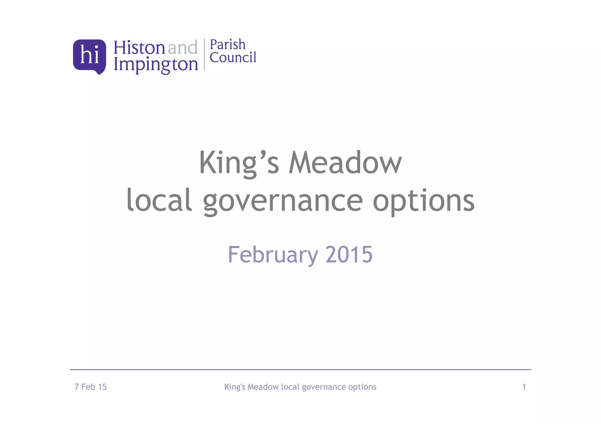 This document discusses local governance options for King's Meadow. It presents three options: 1) Remain part of Histon & Impington Parish Council, 2) Become an independent King's Meadow Community Council, or 3) Join the city of Cambridge. It analyzes the difficulty, funding, understanding of needs, council tax implications, advantages, and disadvantages of each option. A consultation will take place over the next two months, including an online survey and public information event, to get residents' views on the options.