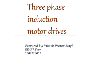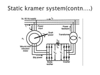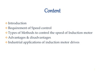 This document discusses speed control methods for three-phase induction motors. It describes various speed control techniques including stator voltage control, stator frequency control, V/F control, and static rotor resistance control. It explains the advantages of speed control, such as energy savings and meeting different process requirements. Industrial applications of induction motor drives are also mentioned, such as in fans, compressors, pumps and machine tools.