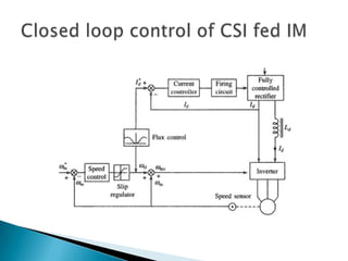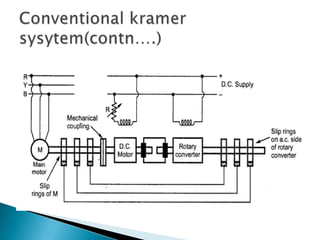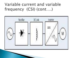 The document discusses variable frequency drives (VFDs) and their applications. VFDs can control the frequency and voltage applied to AC motors to vary their speed. They allow control of parameters like voltage, frequency, and maximum temperature. Common applications of VFDs include heating, ventilation, air conditioning, wastewater treatment, fans, blowers, textile mills and rolling mills. VFDs provide variable frequency and voltage using voltage source inverters, cycloconverters or choppers to reduce harmonic injection into the AC supply.