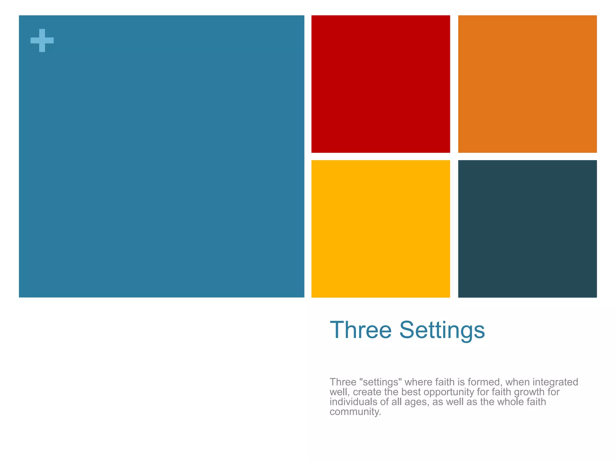 The home, church, and age-specific settings each play an important role in faith formation when integrated well. The whole church provides knowledge of the faith and community life. Families teach moral formation and prayer. Age-specific settings focus on liturgical education and missionary initiation. When these three settings work together, they create the best opportunity for faith growth.