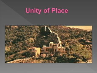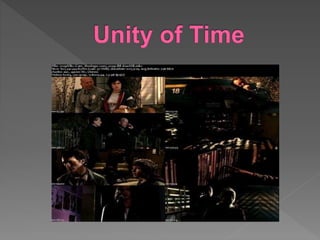 Aristotle established three rules or unities for tragedy - unity of action, time, and place. The passage discusses these classical unities, with unity of action referring to a single plotline and minimal subplots, unity of time restricting the action to 24 hours, and unity of place setting the entire play in a single location. It then provides details about the 2005 film Hostage, directed by Florent Emilio Siri, about a hostage negotiator whose own family is kidnapped as he works to save another family, exploring the tension between his personal interests and professional responsibilities.