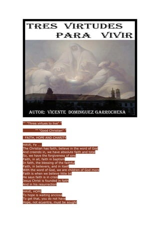 The document discusses the three Christian virtues of faith, hope, and charity. It states that faith is believing in the word of God and being forgiven of sins through baptism. Hope is waiting anxiously for what one does not have and must be sought through faith in God and the church. Charity is having responsibility for Jesus' teachings of love for one's neighbor through solidarity with those suffering. These three virtues - faith, hope, and charity - form the virtues that a good Christian should live by.
