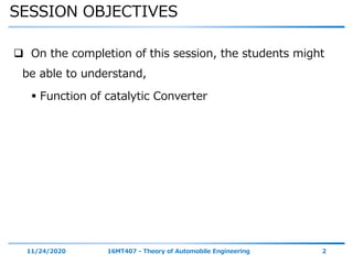 The document discusses catalytic converters, which are emission control devices that convert toxic gases from vehicle exhaust into less toxic pollutants. It describes the functions of catalytic converters, their construction using a ceramic core with precious metal catalysts, and how they work to oxidize carbon monoxide and hydrocarbons while also reducing oxides of nitrogen through redox reactions. The document differentiates between two-way catalytic converters, which control carbon monoxide and hydrocarbons, and three-way catalytic converters, which also control oxides of nitrogen emissions. Three-way catalytic converters are highlighted as the most effective at reducing the three main pollutants from vehicle exhaust.