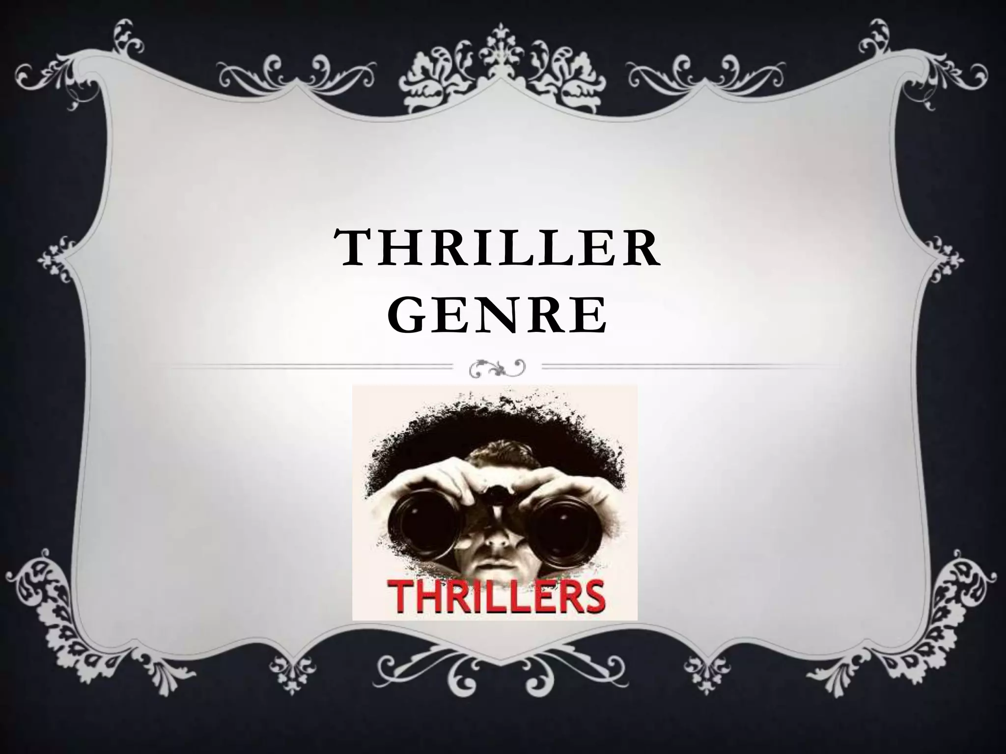 The document discusses the thriller genre and its various subgenres. It defines thrillers as films that create tension and suspense through shocking narrative devices. Key elements include climaxes, villains, mystery, and good vs evil plots. The main subgenres covered are crime thrillers, which focus on solving crimes; mystery thrillers, which involve political assassinations and terrorism; psychological thrillers, which explore mental states; science fiction thrillers, which incorporate futuristic technology; and supernatural thrillers, which feature the supernatural or religious themes.