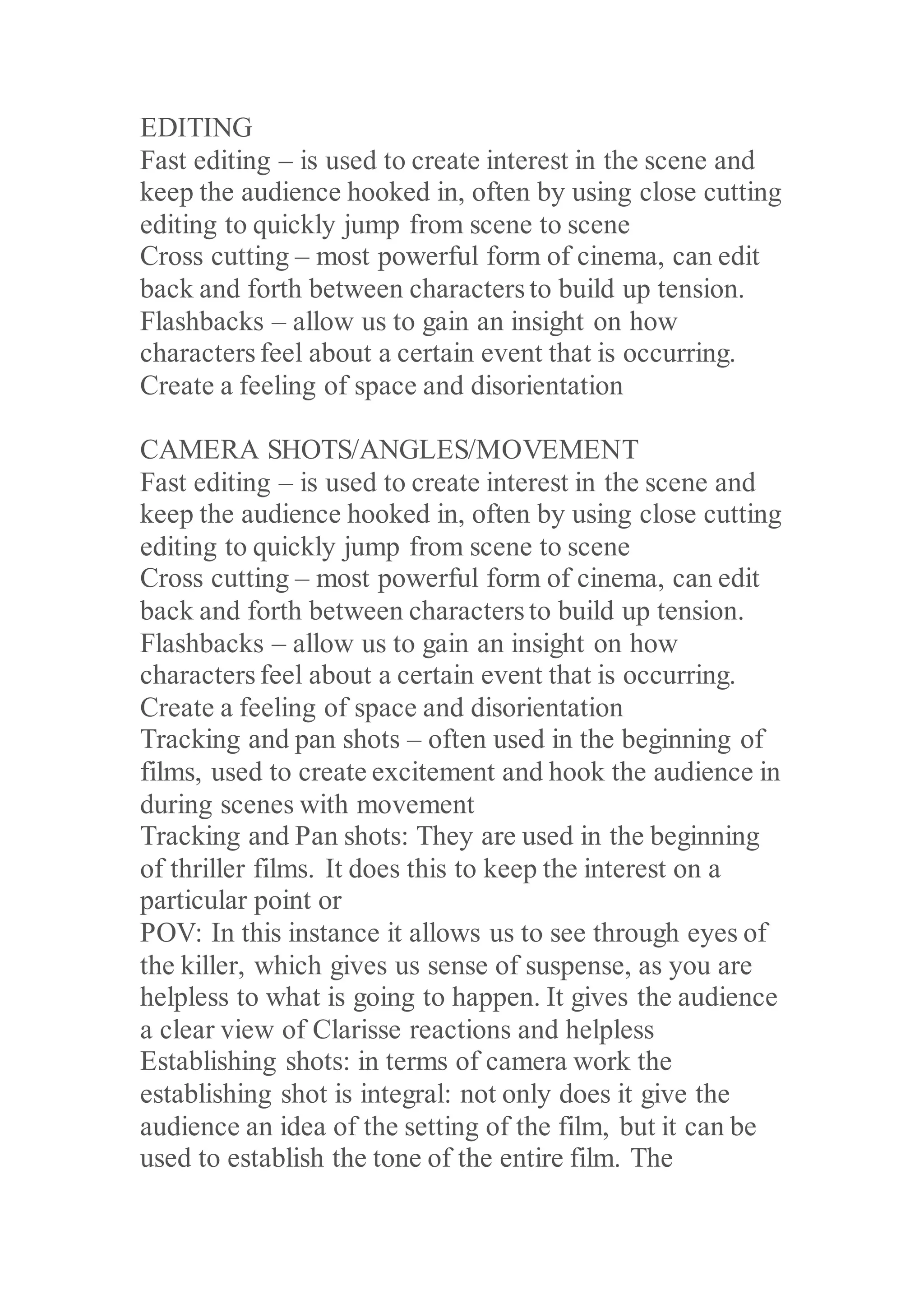 This document discusses various cinematic techniques used in thriller films to create suspense and engage audiences. It covers editing techniques like fast cutting, cross cutting, and flashbacks. It also discusses camera shots and angles such as tracking shots, point of view shots, establishing shots, and close ups. Additionally, it outlines the use of sound, themes, motifs, symbols, ideologies, narratives, character representations, lighting, settings, mood, and tone in thrillers. The goal of these techniques is to keep audiences hooked through the strategic use of suspense-building elements in cinematography, editing, sound, and storytelling conventions.