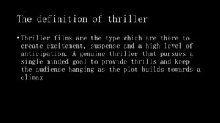 This document discusses the genre of thriller films. It defines thrillers as films that create excitement, suspense, and anticipation by building towards a climactic ending. Alfred Hitchcock directed some of the earliest thrillers in the 1920s-1940s. Common conventions of thrillers include low-key lighting, tense music, cliffhangers, isolated settings, props like guns or knives, and characters like criminals, victims, or stalkers. Popular directors of thrillers include Hitchcock, Nolan, and Scorsese, while actors like Nicole Kidman and Leonardo DiCaprio often appear in them. Thrillers generally target audiences 15+ due to violence but appeal to a wide range of demographics