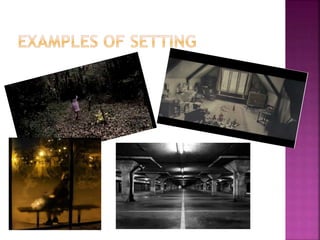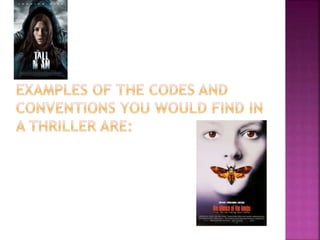 Thrillers use techniques like suspense, tension, and excitement to stimulate the viewer's emotions. Elements of mise-en-scene, sound, editing, narrative structure, setting, characters, iconography, and cinematography help films stick to the thriller genre. For example, dark lighting, ominous music, abrupt cuts, isolated settings, and characters in danger are common codes and conventions used to create anxiety and fear in viewers. Camera shots like close-ups are also important to clearly show emotions and increase tension.