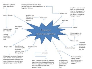 This document summarizes various elements that are commonly included in movie trailers. It explains that a tagline is typically shown at the end to remind viewers of the film title and hint at what the story is about. The trailer also usually displays the genre, release date, production company logo, and any famous actors to help target the intended audience. Non-diegetic sounds, music, and diegetic sounds are used to build tension and suspense around the film.
