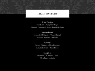 The document analyzes and compares how male and female characters are represented in four thriller films: Gravity, Shutter Island, Pulp Fiction, and Inception. It finds that while the films generally follow genre conventions of masculine and feminine stereotypes, each one also challenges conventions in small ways to make the characters and stories more unique and appealing to audiences.