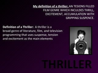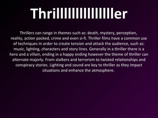 A thriller is a genre of film and television that uses suspense, tension and excitement to grip audiences. Thrillers can explore various themes through crime, mystery, horror and science fiction stories involving death, perception of reality and twisted relationships. Techniques like music, lighting, characters and plotlines create tension to stimulate the audience. Generally thrillers feature a hero and villain concluding in a happy ending, though some have unexpected twists.