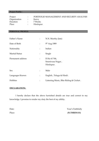 This resume summarizes Thrinay N's qualifications and experience. He has an MBA in Finance and Systems from Sri Krishna Devaraya University with 63% aggregate and a BBM from the same university with 58% aggregate. His skills include basics of HTML, MS Office, and Windows. He completed a 7-week project in portfolio management and security analysis at Karvy in Hindupur. He is declaring that all details in the resume are true.