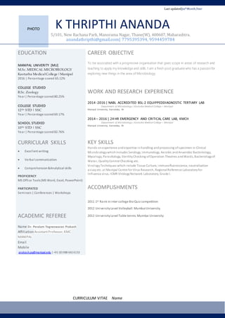 K Thripthi Ananda's curriculum vitae summarizes her education and qualifications. She has a M.Sc. in Medical Microbiology from Manipal University where she scored 65.12%, and holds a B.Sc. in Zoology where she scored 80.25%. Her work experience includes working in the microbiology department and emergency lab at Kasturba Medical College. She has skills in microbiology techniques, tissue culture, and data analysis. Her goals are to apply her knowledge and skills in research and teaching.