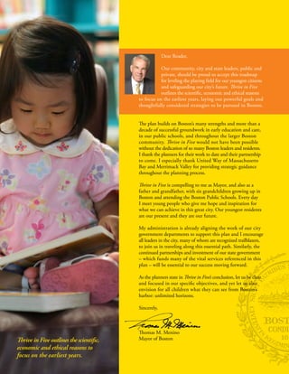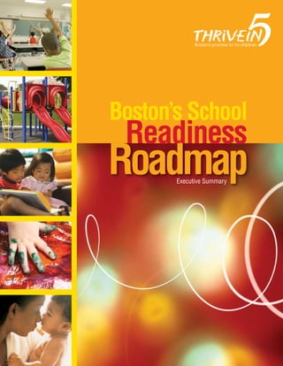 Thrive in Five outlines scientific, economic, and ethical reasons to focus on early childhood development and school readiness. It provides a roadmap developed by Boston leaders to ensure children enter school ready to learn and succeed. The plan aims to support families, improve early education and care, address health issues early, and make children a top city priority. If children receive strong support in their first five years, they will be prepared for educational and life success.