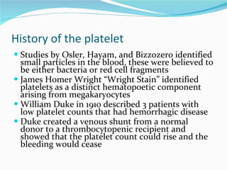 This document outlines essential concepts in hematology, particularly focusing on thrombocytopenia, its definitions, causes, and clinical implications. It details the role of thrombopoietin in platelet production, the significance of platelet counts, and various classifications of thrombocytopenia based on underlying mechanisms. The document also addresses diagnostic approaches and treatment options for conditions like thrombosis and thrombotic thrombocytopenic purpura (TTP).