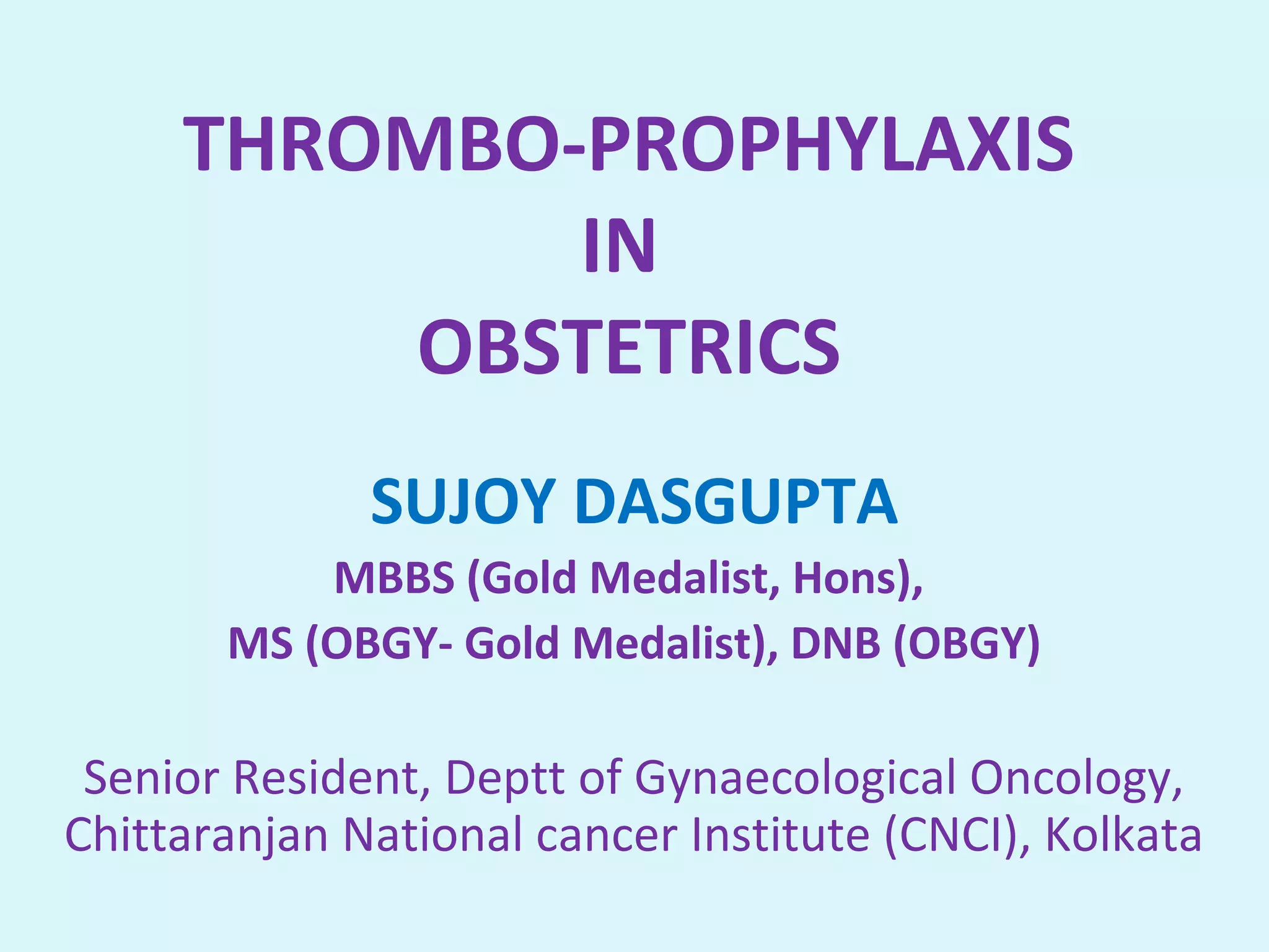 The document discusses the importance of thrombo-prophylaxis during pregnancy, detailing the incidence and risk factors associated with venous thromboembolism (VTE). It emphasizes the need for risk assessment and personalized prophylactic measures, recommending low molecular weight heparin as the preferred treatment. The document also highlights that VTE is a significant concern in both pregnant and postpartum women, particularly in India, where awareness and treatment remain inadequate.