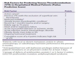 Venous thromboembolism (VTE) manifests as deep vein thrombosis (DVT) or pulmonary embolism (PE) from thrombus formation in the venous circulation. Risk factors include immobilization, surgery, trauma, cancer, and genetic hypercoagulable states. Symptoms are nonspecific so objective tests like ultrasound or CT scan are needed to diagnose. Prevention involves pharmacologic methods like blood thinners or compression stockings, and non-pharmacologic methods like early ambulation. Treatment consists of acute blood thinners followed by long-term oral anticoagulants to prevent recurrence, with duration depending on provoking factors.