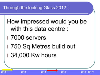 The document summarizes a presentation given to the AFCOM Melbourne Chapter in February 2012 titled "Through the Looking Glass 2012." It discusses trends in technology from 2012 to 2017 and their impact on data centers. Key points include: