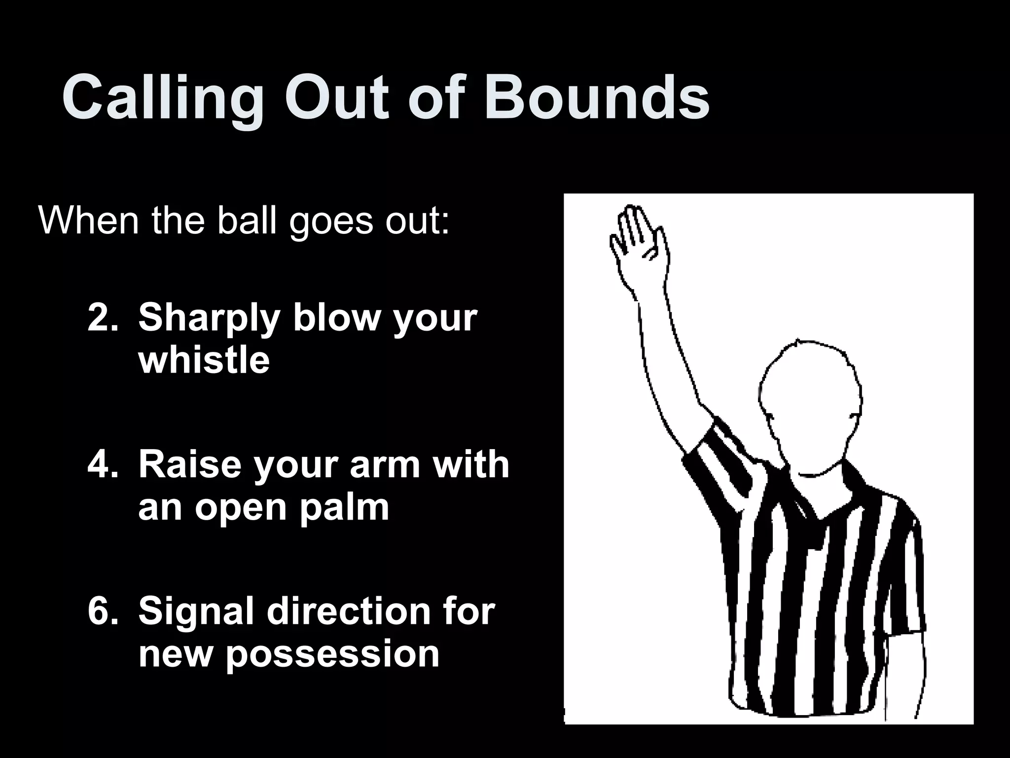 1) When the ball goes out of bounds, the official should sharply blow their whistle, raise their arm with an open palm, and signal the direction of the new possession.