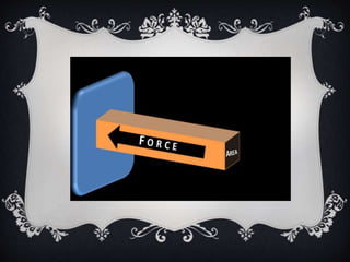 The document defines thrust as a force applied perpendicularly to a surface, while pressure is the effect of thrust per unit area. Pressure depends on both the applied force and the contact area - the same force will produce less pressure over a larger area but more pressure over a smaller area. Everyday examples are provided like school bags distributing weight over shoulders, knives cutting with focused force, and vehicle tires spreading weight to reduce sinking.