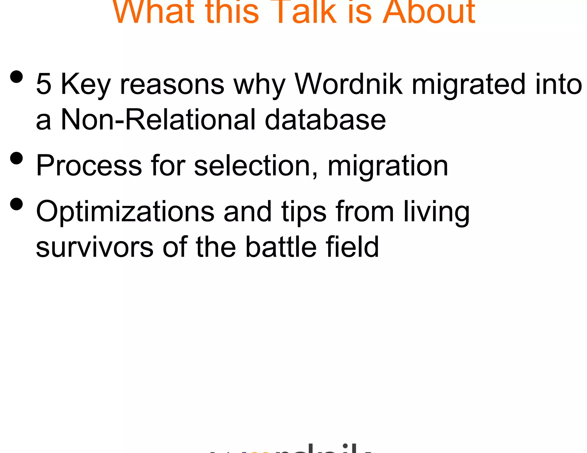 Wordnik migrated from a MySQL database to a MongoDB non-relational database for 5 key reasons: speed, stability, scaling, simplicity, and their data needs. They tested multiple NoSQL solutions over 8 weeks before selecting MongoDB. The migration process required iterating their object mapping and data access patterns. They used a temporary switch to migrate production data with zero downtime. Performance optimization involved moving to physical data centers and pre-fetching on updates.