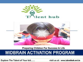 The document advertises services from Talent Hub, an institute that helps children develop their talents and mental abilities. It promotes a "Mid-Brain Activation" program beginning in 1919 in the US that uses science-based, fun activities to improve memory, concentration, learning speed, and overall brain function. Talent Hub claims its methods can help children succeed academically while reducing stress and anxiety, allowing them to discover talents and strengthen relationships with parents.