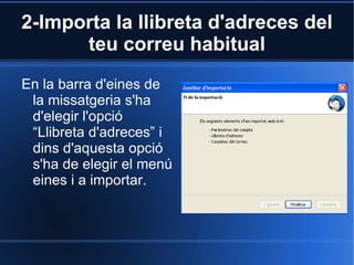 2-Importa la llibretad'adreces del teu correu habitual En la barra d'eines de la missatgeria s'ha d'elegir l'opció “Llibreta d'adreces” i dins d'aquesta opció s'ha de elegir el menú eines i a importar.