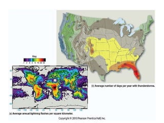 This document discusses thunderstorms and tornadoes. It begins by defining a thunderstorm and outlining the typical stages of thunderstorm development: the cumulus stage dominated by updrafts, the mature stage with both updrafts and downdrafts, and the dissipating stage dominated by downdrafts. It then contrasts air mass thunderstorms and severe thunderstorms, noting that severe storms are longer-lived due to wind shear tilting the updraft. Finally, it describes supercell thunderstorms which can spawn tornadoes due to their rotating mesocyclone updraft structure.