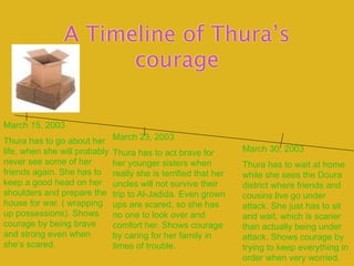 Thura Al-Windawi is a young Iraqi girl who kept a diary during the 2003 Iraq War. The diary documents her courage in facing numerous challenges over the course of the war, from having to prepare her home for war and care for her family, to leaving Baghdad fearing she may never return, to being interviewed by American reporters and speaking her mind. Throughout difficult and dangerous situations, Thura consistently showed bravery in putting her family first and trying to maintain normalcy, demonstrating her strength and hope for a better future.