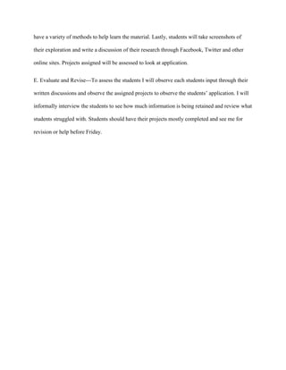 Students will recognize and describe key battles during the revolutionary war through exploration of museums in Second Life and online research. They will create avatars to take pictures in virtual museums, and gather information about battles from Facebook, Twitter, and a website. Students will be required to participate in collaborative projects utilizing these online resources, and share what they learn through screenshots and written discussions. Their work will be assessed to evaluate their understanding and application of the material.