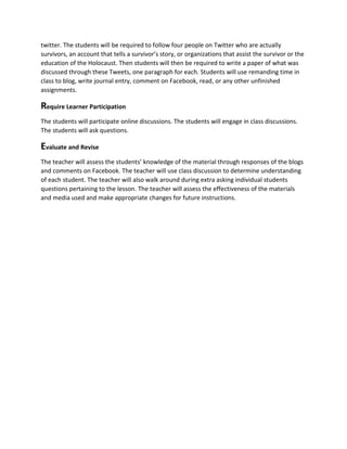 The document outlines a lesson plan to teach 22 middle school students about resistance and rescue movements during the Holocaust. It will use various digital tools and media like YouTube, blogs, Facebook, and Twitter. The teacher will start with a YouTube video on the end of the Holocaust and lead a discussion. Students will then read and comment on the teacher's blog. Next, they will watch a video on Facebook and comment on it as homework. Finally, students will follow Holocaust survivors on Twitter and write paragraphs summarizing each account. The teacher will evaluate students' understanding through their online responses and discussions.