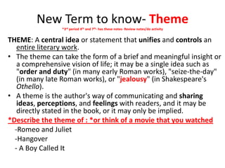 The document provides notes and objectives for an English class. It introduces the literary term "theme" and defines it as the central idea or statement that unifies a literary work. Students are asked to describe the theme of Romeo and Juliet or a movie they have watched. The class will also review terms like metaphor, simile, imagery and identify them in a sample poem. Students will analyze a poem by Robert Frost and discuss what it means and how they know the theme.