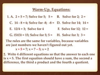 The document provides instructions and examples for solving integer equations and working with absolute values. It discusses key concepts like: