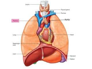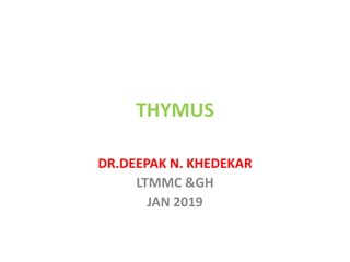 The thymus is a primary lymphoid organ located in the superior mediastinum. It plays a key role in T cell development and maturation. The thymus has an outer capsule and is divided into lobules containing cortex and medulla regions. The cortex contains densely packed developing T cells and epithelioreticular cells. The medulla is less cellular and contains Hassall's corpuscles. Developing lymphocytes interact with epithelioreticular cells, which provide structural support and signals to guide T cell maturation.