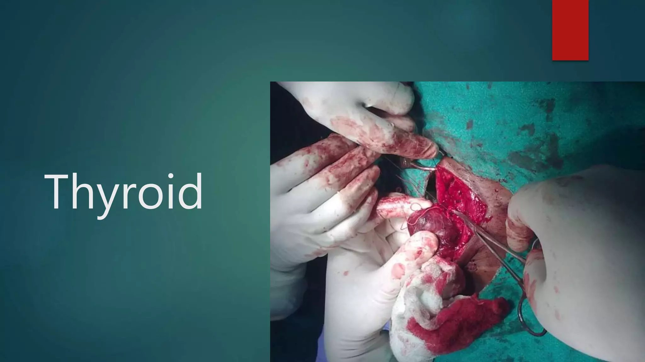 This document provides an overview of the thyroid gland, including its anatomy, embryology, histology, physiology, common diseases and disorders. It discusses topics such as thyroid development, hormone production, hyperthyroidism and hypothyroidism, different types of thyroiditis including Hashimoto's, and thyroid tumors. The key information covered includes the location and blood supply of the thyroid, how it produces thyroid hormones and calcitonin, common signs and symptoms of overactive and underactive thyroid, and descriptions of Graves' disease, multinodular goiter, thyroid storm, and different forms of thyroiditis.