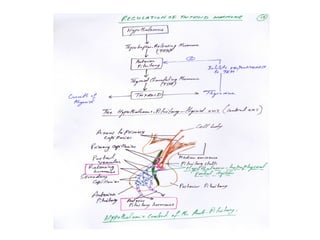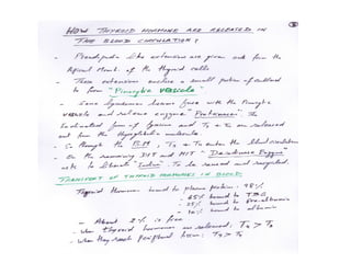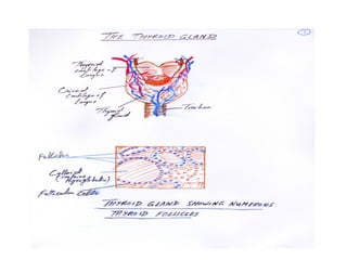 The thyroid gland, located below the larynx and anterior to the trachea, secretes key hormones including thyroxine (T4), triiodothyronine (T3), and calcitonin, with T4 being the predominant hormone. Thyroid hormone production is regulated by thyroid-stimulating hormone (TSH) from the anterior pituitary, influencing metabolic rates, growth, and various bodily functions, with T3 being more potent than T4. Dysfunctions in thyroid hormone levels can lead to conditions such as hyperthyroidism and hypothyroidism, each presenting various physiological symptoms and requiring distinct treatment approaches.