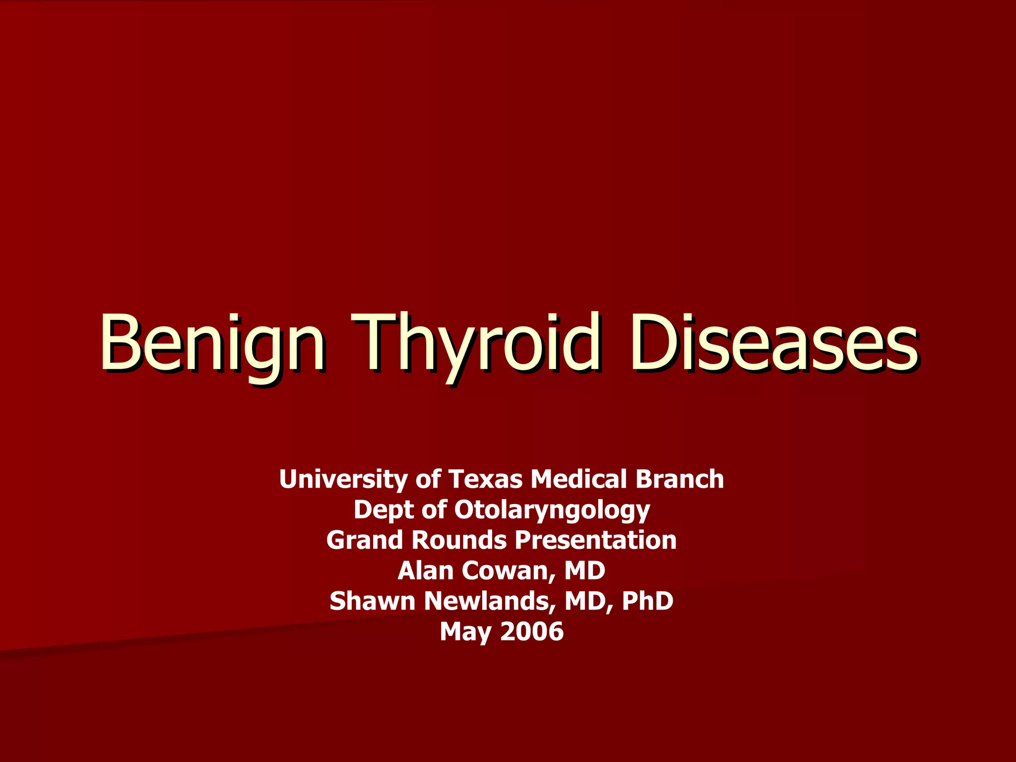 This document provides a summary of benign thyroid diseases and their history, physiology, evaluation, and treatment. It discusses various thyroid conditions including goiter, hypothyroidism, hyperthyroidism, thyroiditis, and toxic nodular goiter. For each condition, it outlines the etiology, pathogenesis, diagnosis, and standard treatment approaches. It also reviews the history of thyroid surgery and advances in the understanding and management of thyroid function.