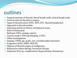The document provides a comprehensive overview of thyroid nodule management, including surgical anatomy, types of thyroid cancer, diagnostic approaches, and treatment options. It details the surgical procedures involved in thyroidectomies, complications, and the necessary preoperative assessments, emphasizing the roles of ultrasound and fine needle aspiration. Additionally, it covers the prognosis and categorization of different thyroid cancers, highlighting the importance of tailored surgical approaches based on specific conditions.