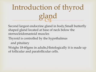 The thyroid gland is located in the neck and produces hormones that regulate metabolism. It contains two main hormones: T3 and T4. The thyroid is controlled by the hypothalamus and pituitary gland. Hypothyroidism is caused by an underactive thyroid and results in low hormone levels and symptoms like fatigue and weight gain. It is typically treated with levothyroxine hormone replacement therapy. Hyperthyroidism is caused by an overactive thyroid and results in high hormone levels and symptoms like weight loss and palpitations.