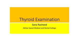The document provides instructions for examining the thyroid gland. It begins with introducing oneself to the patient and obtaining consent. It describes the anatomy of the thyroid gland and its location. The examination involves inspection of the thyroid from the front and back while palpating and feeling for nodules or irregularities. Signs of hyperthyroidism like eye signs, tremors, and moist skin are also checked. The examination is concluded by checking reflexes and the heart before thanking the patient.