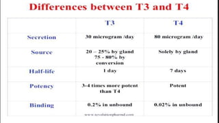 The thyroid gland produces thyroid hormones that regulate metabolism. Disorders include hypothyroidism and hyperthyroidism. Thyroid function tests measure levels of thyroid hormones like T4 and T3, as well as thyroid stimulating hormone, to help diagnose thyroid disorders. Abnormal levels can indicate hypothyroidism or hyperthyroidism and different tests are used together to evaluate thyroid function.