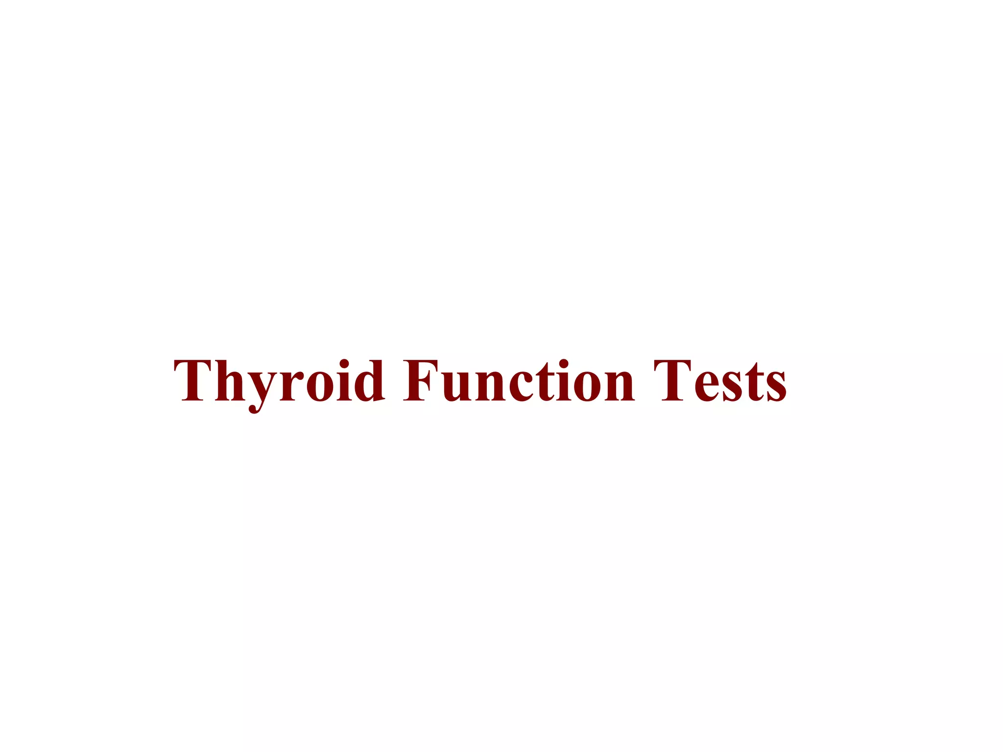 This document summarizes thyroid function tests. It describes the thyroid hormones T4 and T3, their binding proteins, and differences between the hormones. Thyroid disorders like hypothyroidism and hyperthyroidism are discussed along with their symptoms and causes. Various thyroid tests are outlined that measure thyroid hormone levels, evaluate the hypothalamic-pituitary-thyroid axis, assess thyroid gland function, and detect antibodies. Reference ranges are provided for tests like free T4, total T4, T3 resin uptake, free T4 index, total T3, TSH, and radioactive iodine uptake. The summary provides expected results for these tests in conditions like hypothyroidism, hyperthyroidism,