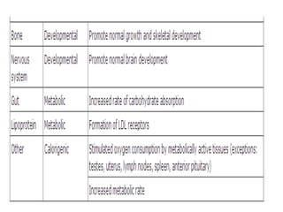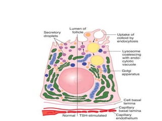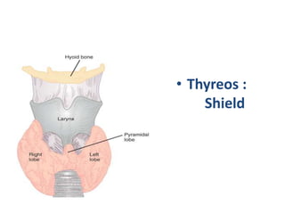 The thyroid gland is the largest endocrine gland located in the neck. It produces thyroid hormones such as T4 and T3 that regulate metabolism. The thyroid follicles contain colloid made of thyroglobulin, which iodine is attached to in order to produce the hormones. The hormones are then released into circulation and have widespread effects increasing the basal metabolic rate and promoting growth and development. Thyroid hormone production is regulated by TSH from the pituitary gland in a negative feedback loop. Disorders can result from too much or too little thyroid hormone production and affect many body systems.