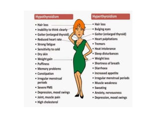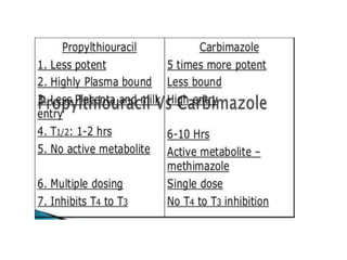 The thyroid gland secretes three main hormones: thyroxine (T4), triiodothyronine (T3), and calcitonin. T4 is secreted in the largest amount but T3 has higher biological activity. The thyroid regulates metabolism, growth, and development through a negative feedback loop with the pituitary gland and hypothalamus. Hypothyroidism can cause myxedema coma, a life-threatening condition treated with thyroid hormone replacement. Hyperthyroidism treatments include anti-thyroid drugs that block hormone synthesis or radioactive iodine that destroys the thyroid gland.