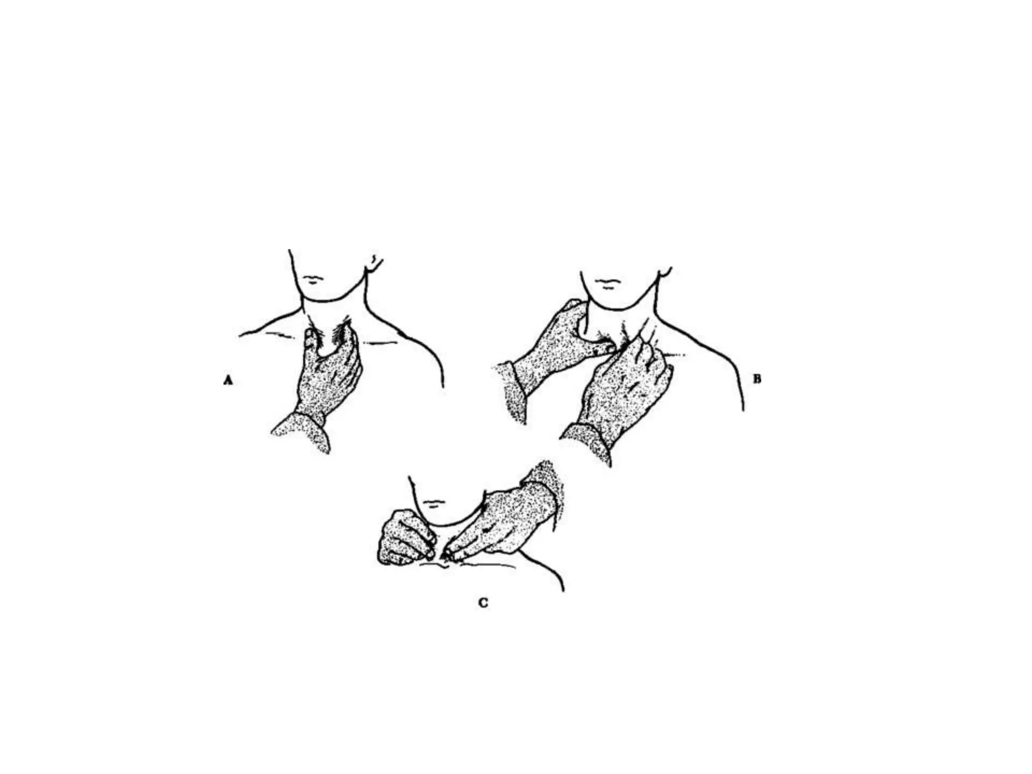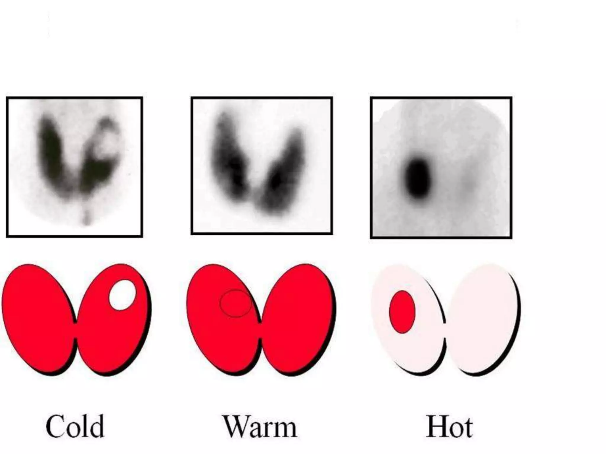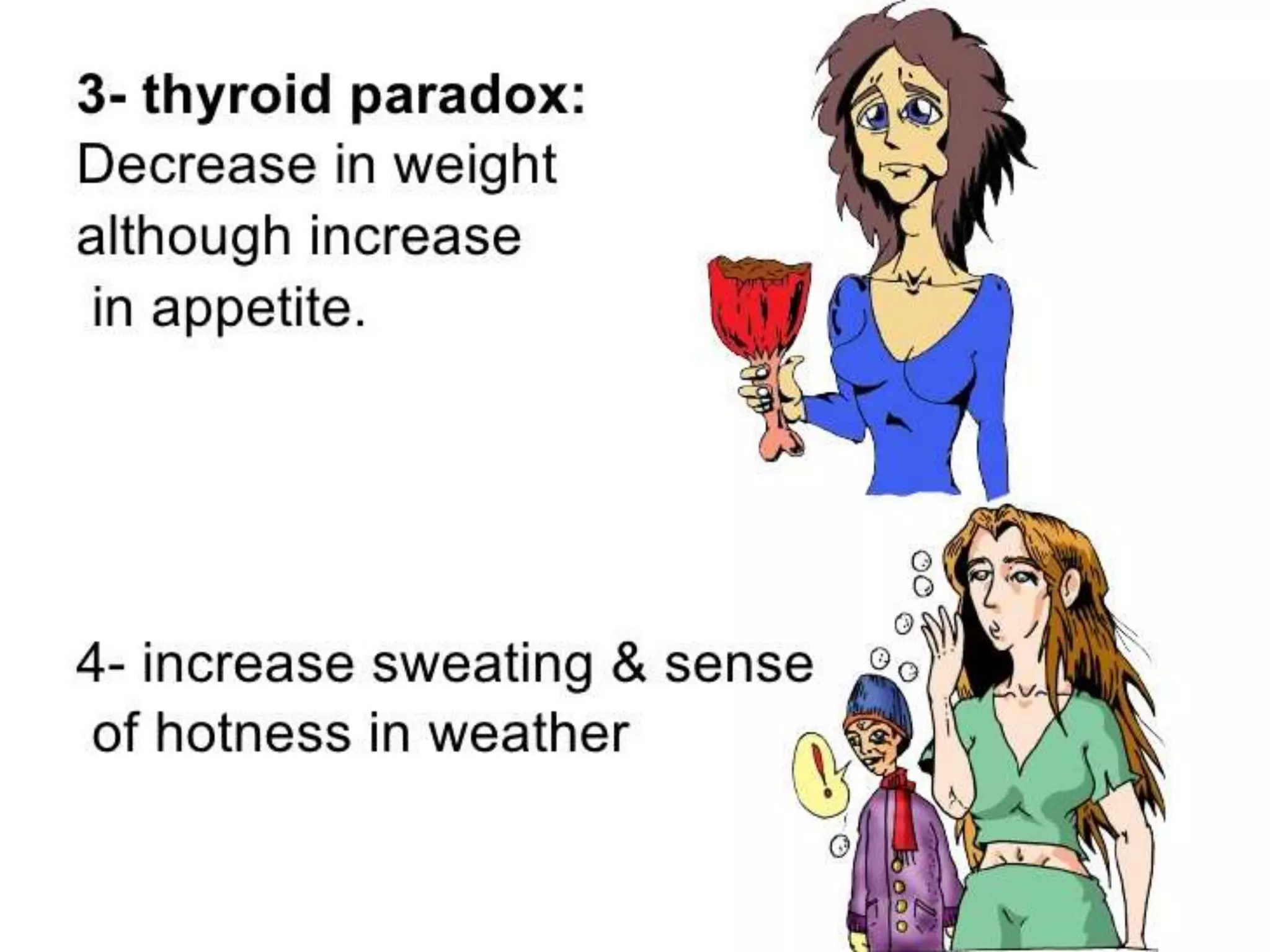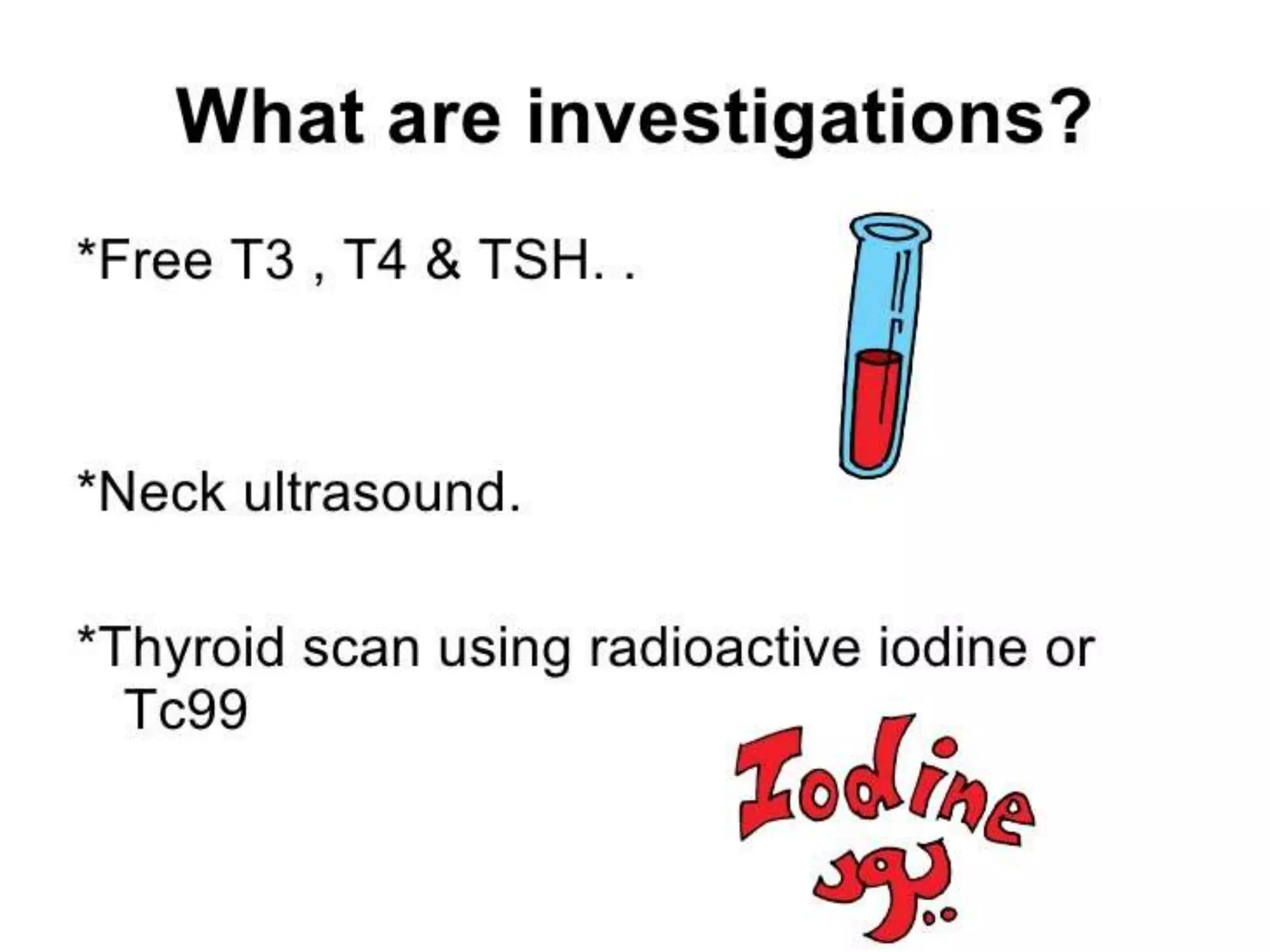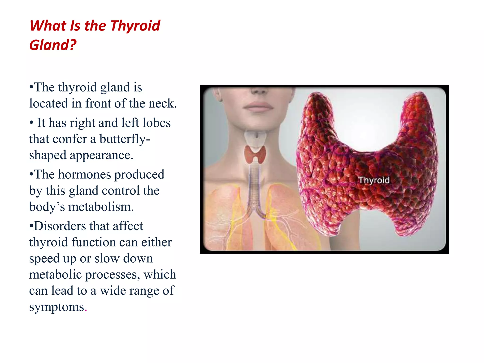 The thyroid gland secretes hormones that regulate metabolism. Disorders can cause hyperthyroidism (overactive thyroid) or hypothyroidism (underactive thyroid). Examination of the thyroid involves inspection for size/shape, palpation for consistency/nodules, and auscultation for bruits. Blood tests measure thyroid hormone levels while ultrasound images the gland. Mild cases may only require monitoring but severe or abnormal cases should be referred to an endocrinologist.