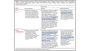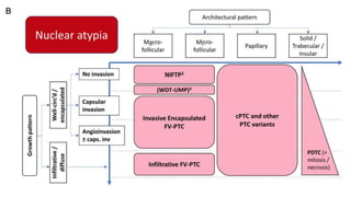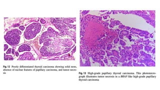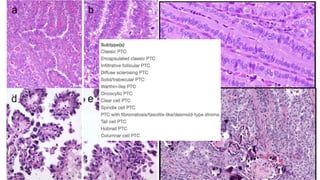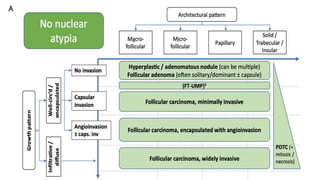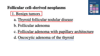 4. Specific tumor types are discussed like papillary thyroid carcinoma, follicular thyroid adenoma and carcinoma, and