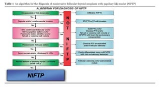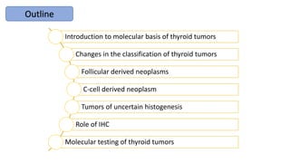 This document discusses molecular approaches and updates in the classification of thyroid neoplasms. It covers: