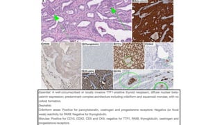 3. The importance of immunohistochemistry and molecular testing to classify tumors and guide treatment. Tests for BRAF, RAS, TRK, ALK, and PTEN are highlighted.