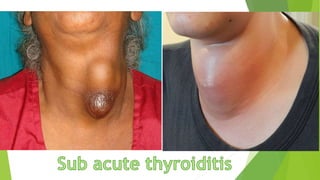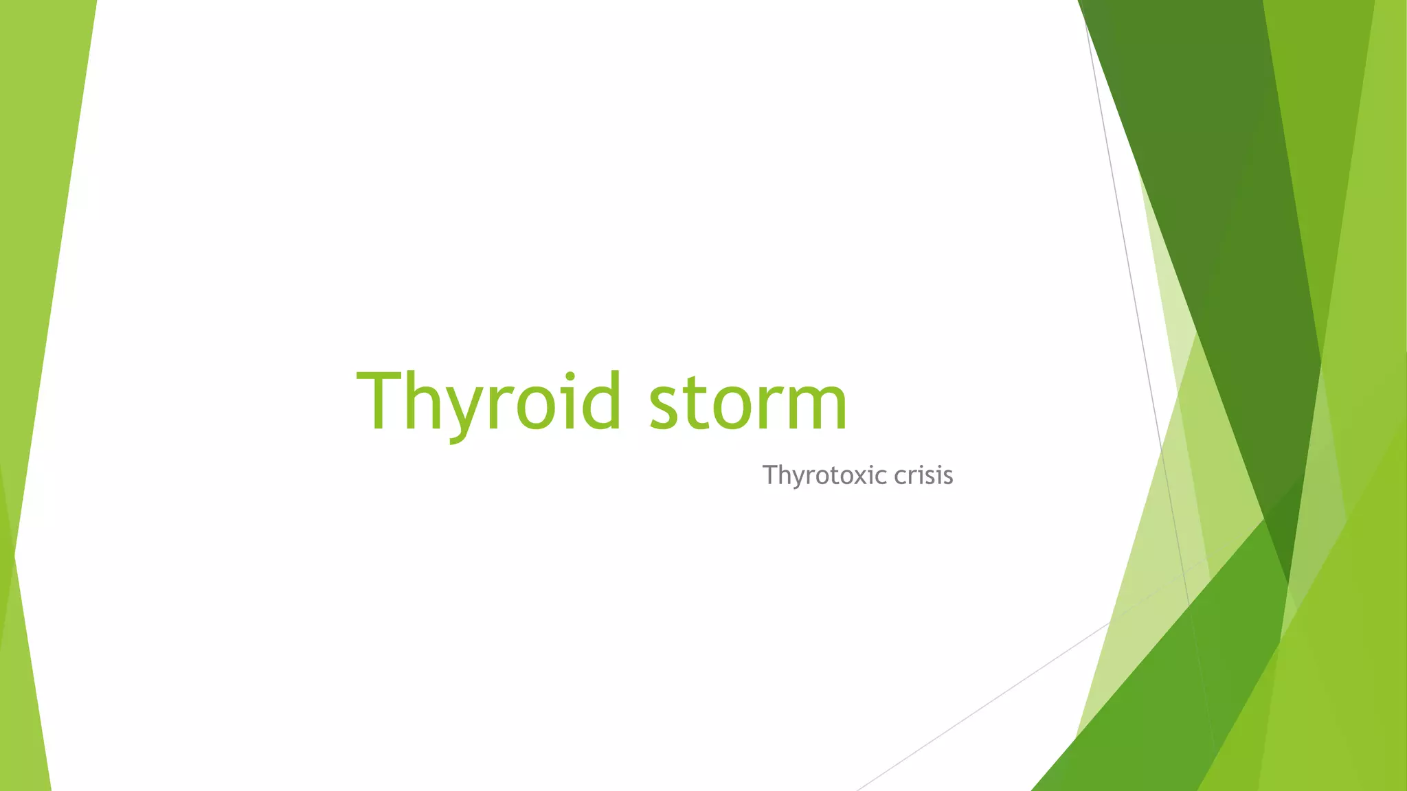 Hyperthyroidism and thyrotoxicosis occur when the thyroid gland overproduces thyroid hormones. Thyroid storm is a life-threatening exacerbation of thyrotoxicosis caused by factors like infection, surgery, or medication changes. It involves fever, sweating, tachycardia, anxiety, and heart failure. Treatment focuses on cooling the patient, blocking further hormone production with antithyroid drugs and iodine, and supporting heart and brain function with beta-blockers and glucocorticoids. Thyroidectomy may be required for severe cases not responding to medical management.