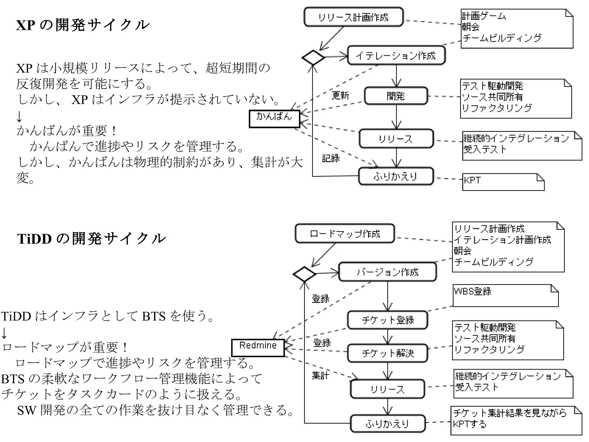 TiDDとXPの開発サイクルの対比イメージ チケット駆動開発とアジャイル開発の密接な関連: プログラマの思索 http://forza.cocolog-nifty.com/blog/2009/09/post-c8bc.html